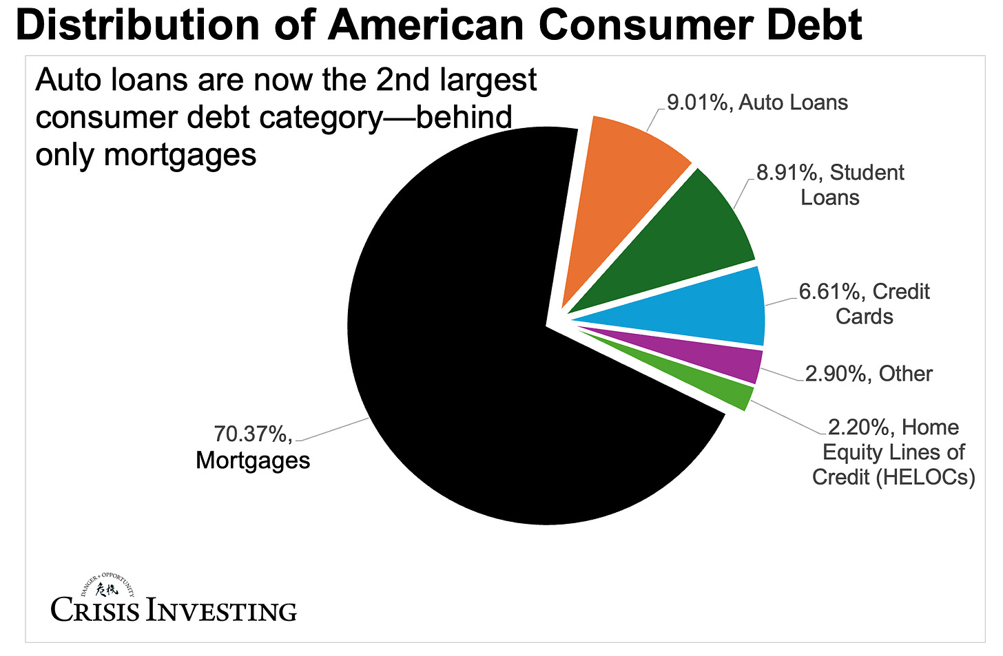 The trend has been so relentless that car loans now make up the second-largest consumer debt category—behind only mortgages. Just take a look at the distribution of American consumer debt below.