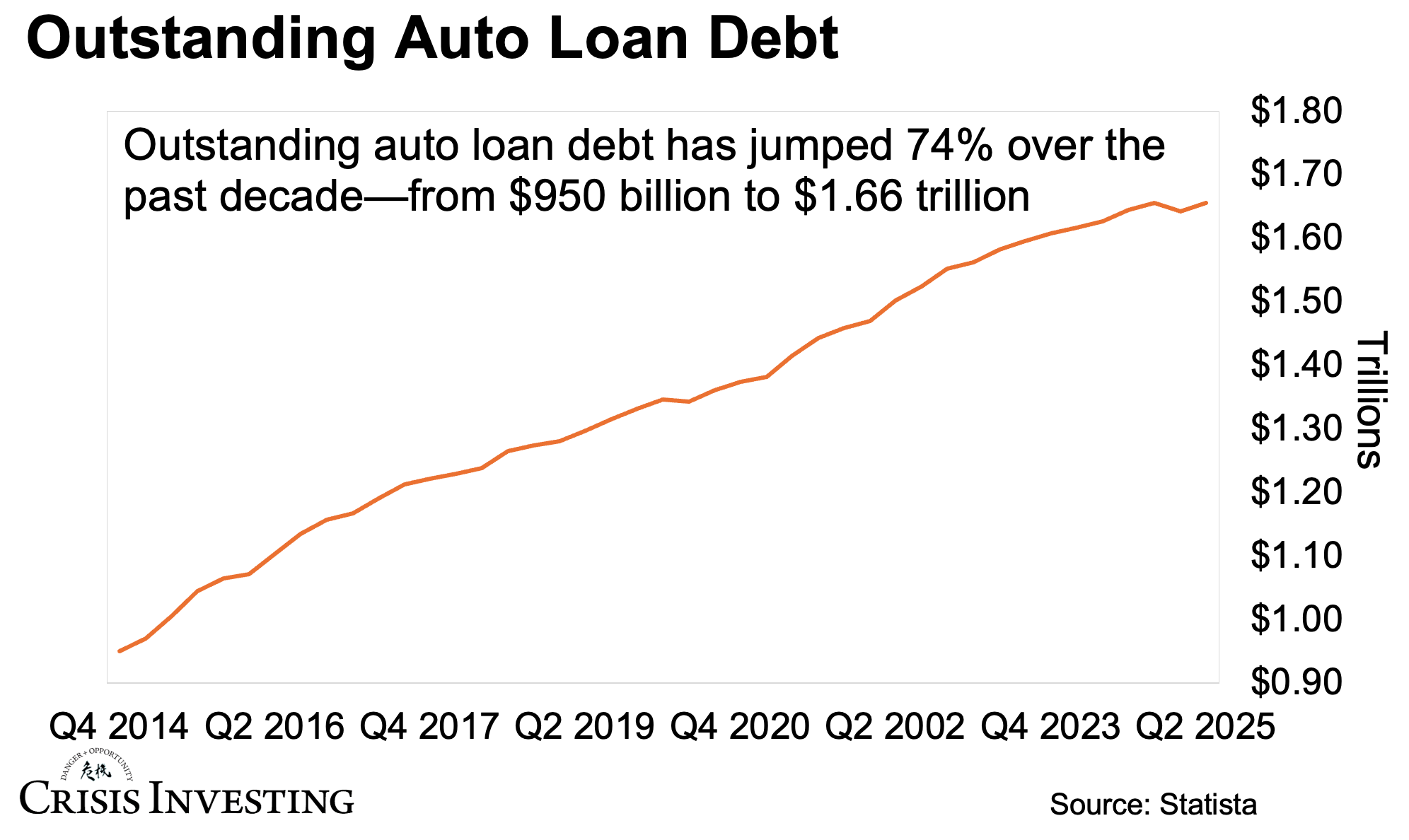As you can see, outstanding auto loan debt has surged 74% over the past 10-plus years—from around $950 billion in late 2014 to $1.66 trillion today.