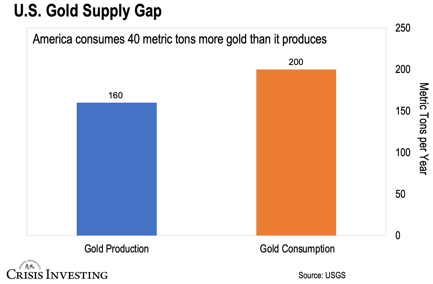 As you can see, the U.S. produces only 160 metric tons of gold per year—roughly 6% of global production. But it consumes around 200 tons annually. That’s a 40-ton shortfall.