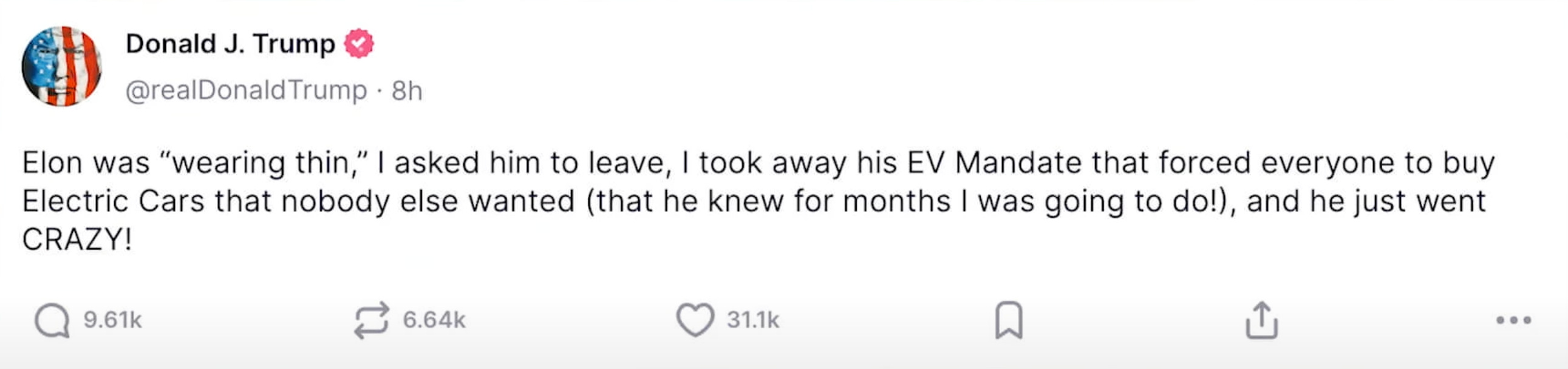 Plus, it's not like Trump's anti-EV stance was some big secret. The guy literally campaigned on ending Biden's "EV mandate."