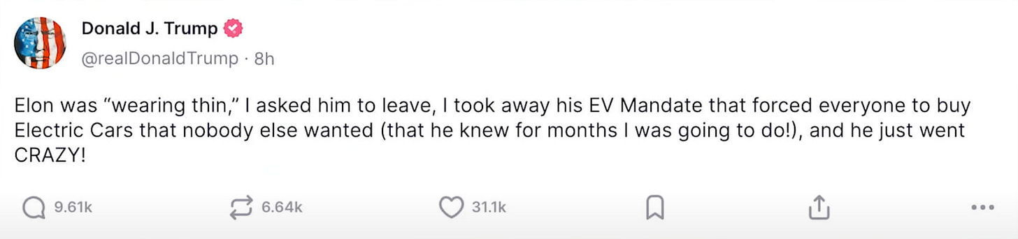 Now, to be fair, Musk did seem like he was running on fumes toward the end of his DOGE tenure. And yes, his tweet barrage against Trump came off a little... unhinged.
