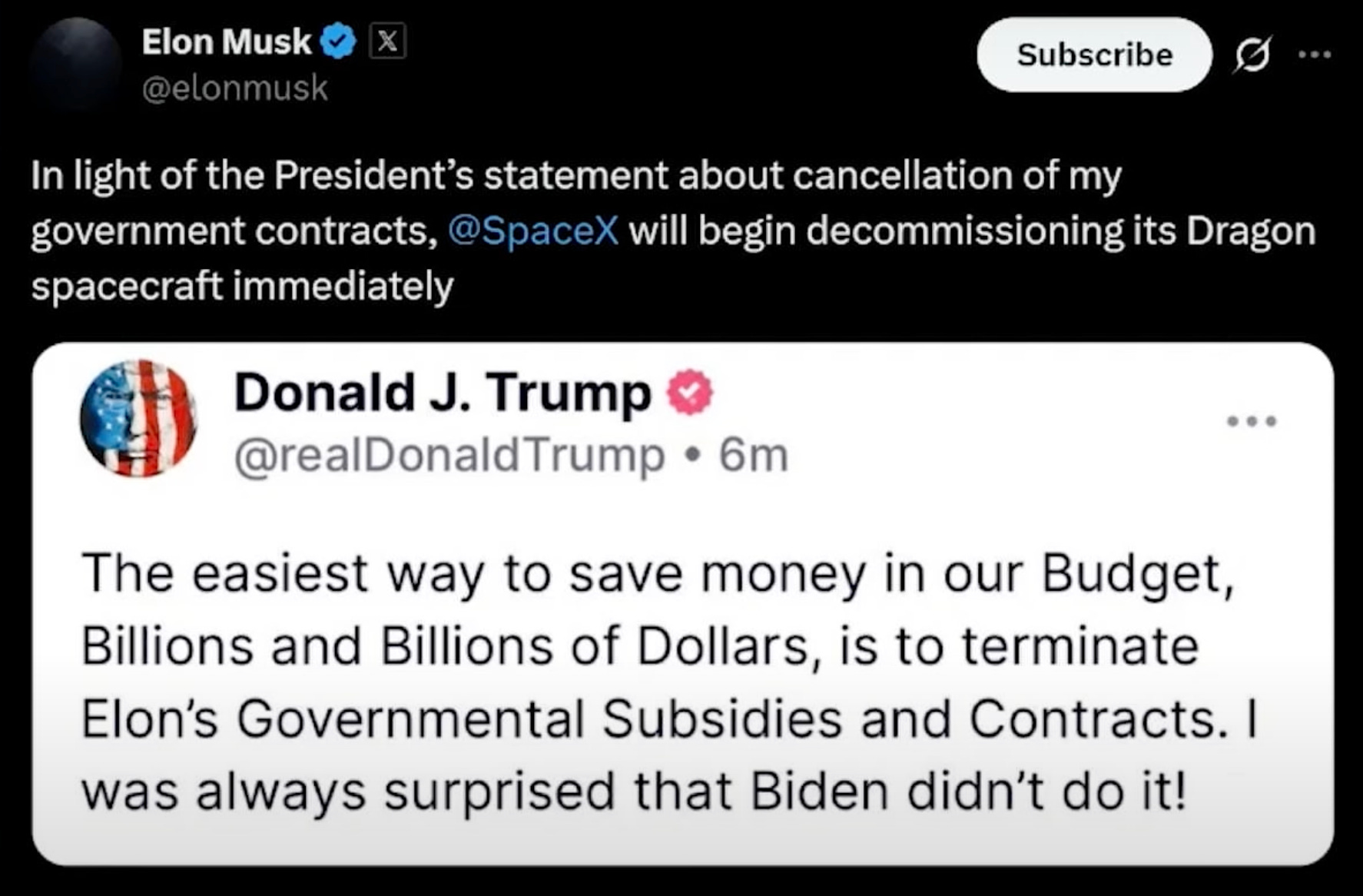 Throwing “cooler heads prevail” out the window, Musk fired back at Trump's threats to kill his government contracts with this post: