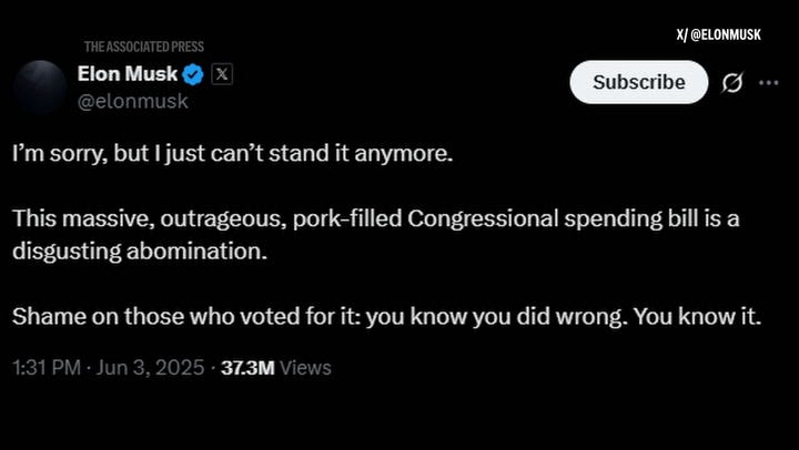 As you probably know, the Trump–Musk breakup began over Musk’s growing dissatisfaction with Trump’s “Big, Beautiful Bill.” As Musk put it: