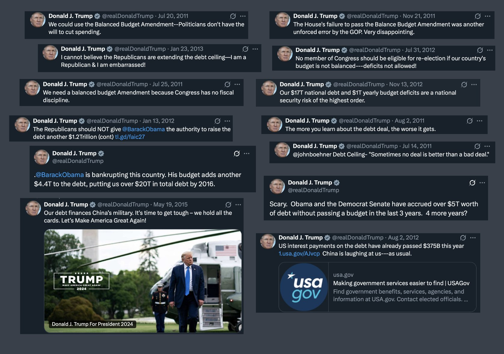 Unfortunately, consistency isn’t exactly Trump’s strong suit. Just take a look at this grab bag of his past tweets—ranting about the national debt, slamming Congress for not balancing the budget, and railing against reckless spending. All the things that supposedly disappeared once it was his big, beautiful deficit.