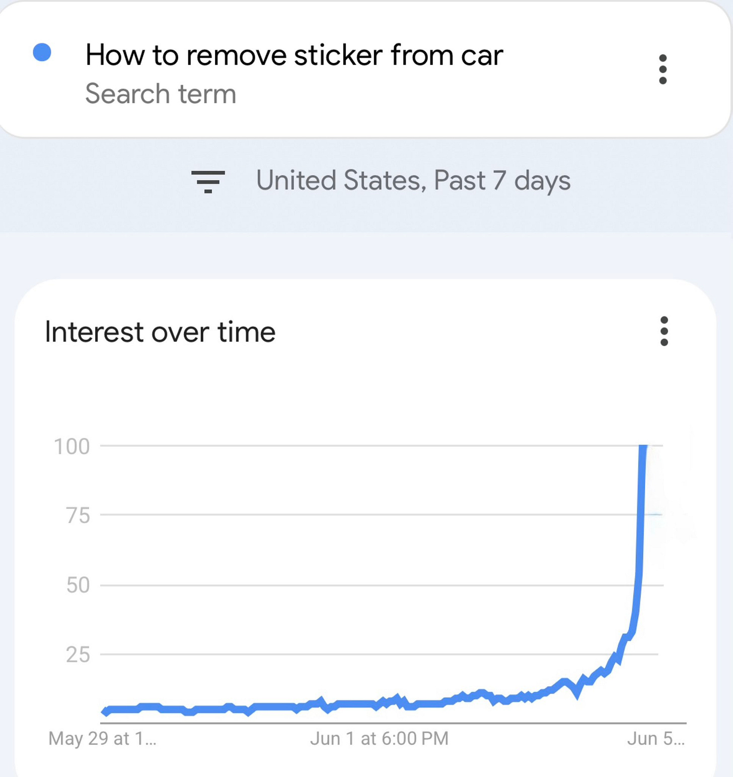 On June 5, searches for “how to remove sticker from car” spiked. That’s right—blue-state liberals were busy peeling off their Musk protest decals. If Google Trends is any indicator, he might just be winning back a few fans from the other side.