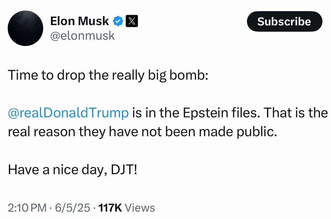 To pour salt on the wound, on June 5, Trump floated the idea of just scrapping the debt ceiling entirely. Musk thought that was absolutely insane. Coincidentally—or not—that was the same day Musk struck back with the Epstein files tweet.