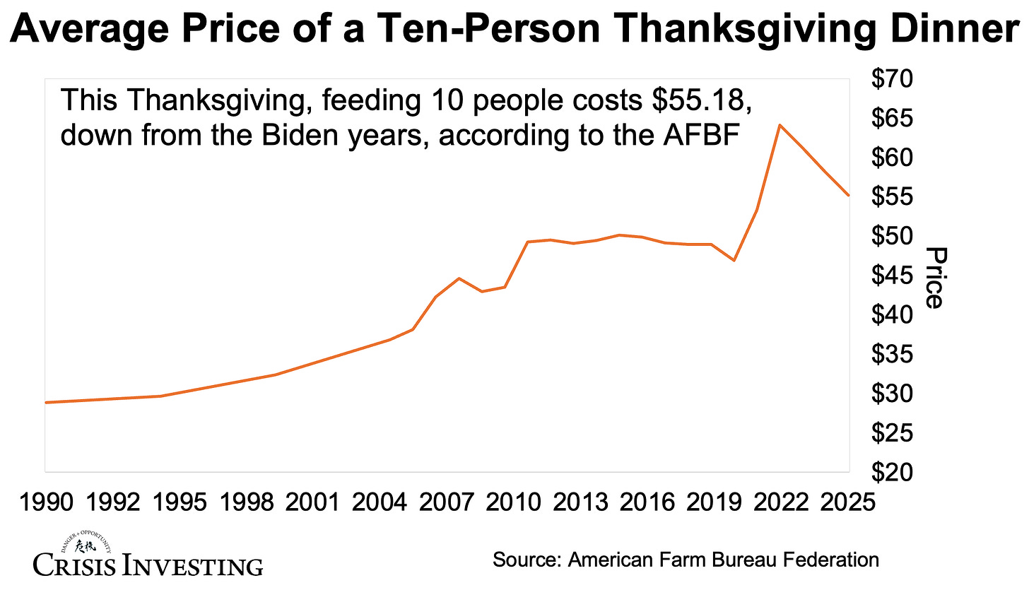 Now, before we all break out the champagne and toast to our newfound prosperity, let’s talk about what’s actually happening here. Take a look at this week’s chart below, showing the AFBF’s official Thanksgiving dinner cost estimates over recent years.