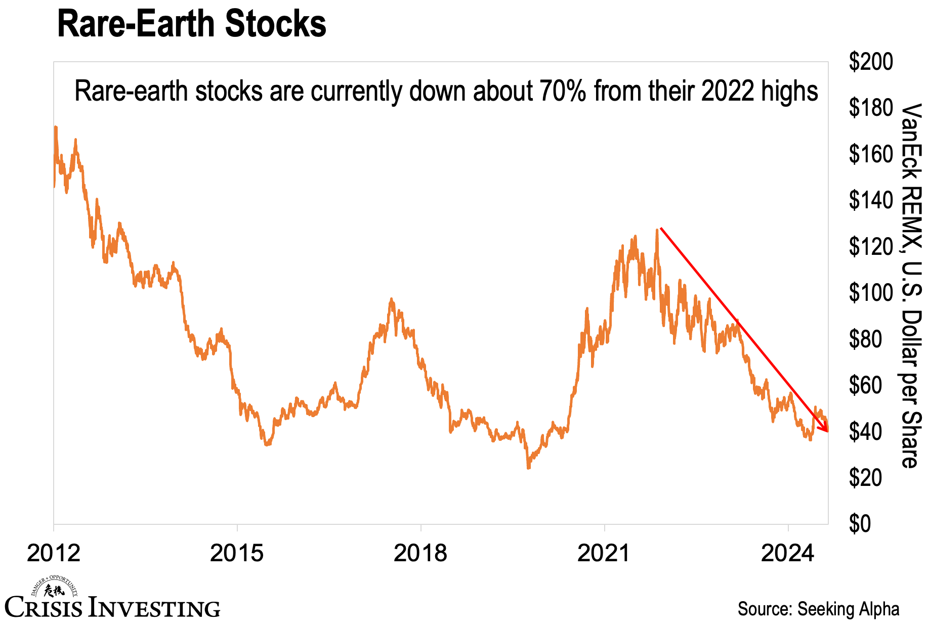 Now, another thing to note—especially since it’s not super clear in the chart above—is just how much rare earth stocks remain down from the 2010 bull market. That was when the Chinese rare earths export ban I mentioned earlier sparked a real mania in REE stocks. While I couldn’t track down all the price data going that far back for the chart above, a quick search on Yahoo Finance (or similar platforms) will show you that REMX is now trading nearly 90% below its 2010 highs. This highlights two things: 1) REE stocks are cheap right now, and 2) just how high they could soar if China decides to shut off the taps again.