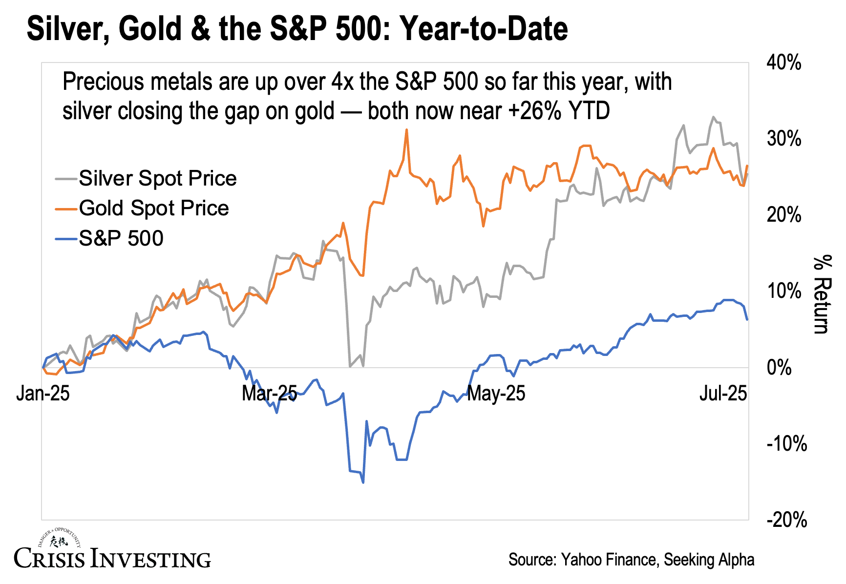 Gold is up 25% year-to-date, silver has gained 26%, and the S&P 500? Barely limping along with just 6%. That means precious metals are beating mainstream stocks by a factor of four so far this year. Yes, you read that right — four times the return of the almighty S&P 500.