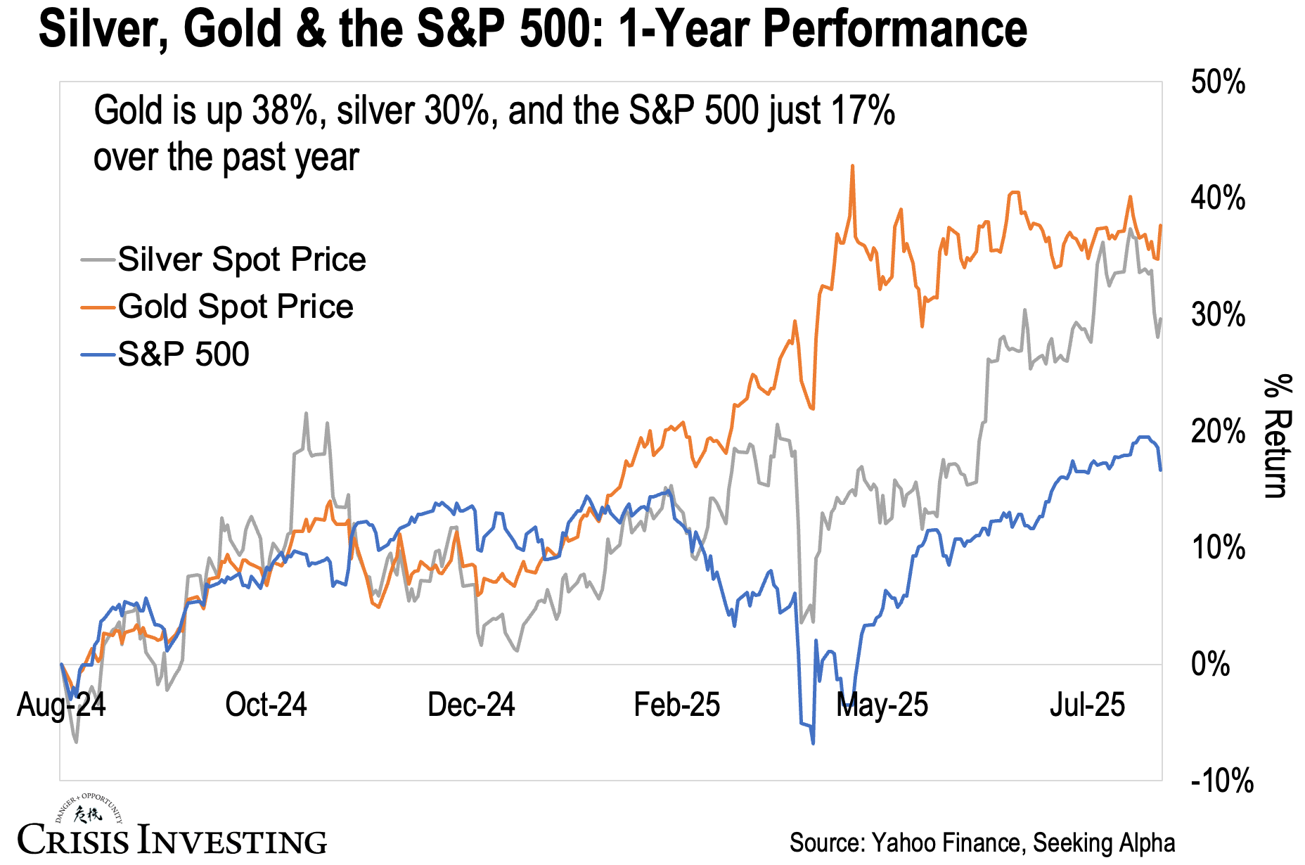 As you can see, both metals absolutely crushed mainstream stocks. Gold delivered a stellar 38% return over the past 12 months, while silver posted a solid 30%. Meanwhile, the S&P 500 managed a measly 17%.