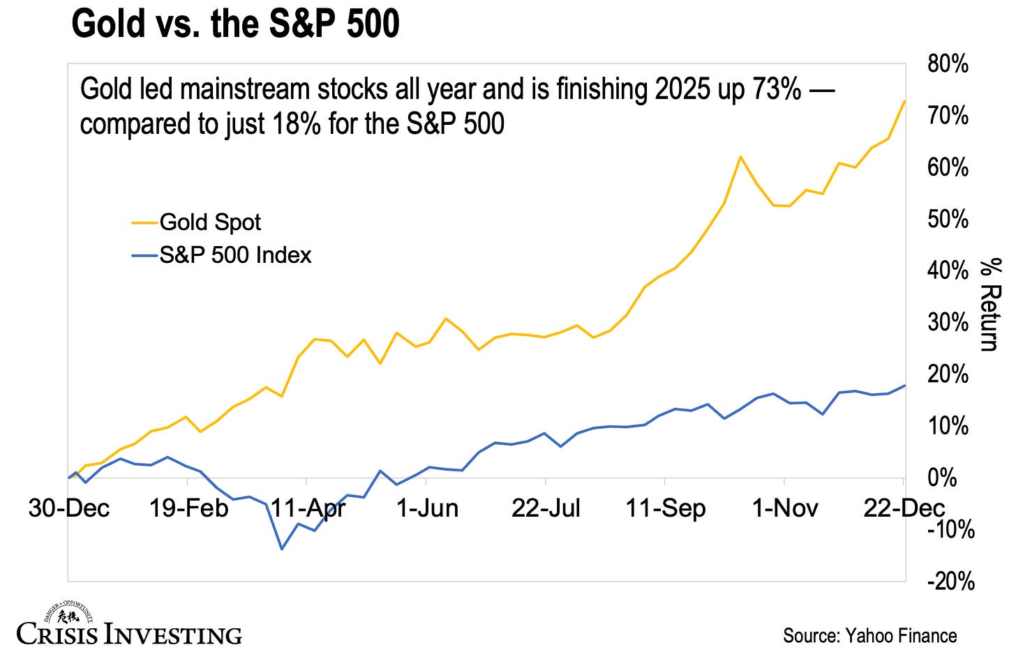 Gold led mainstream stocks all year, ending 2025 up 73% versus the S&P 500’s 18%.
