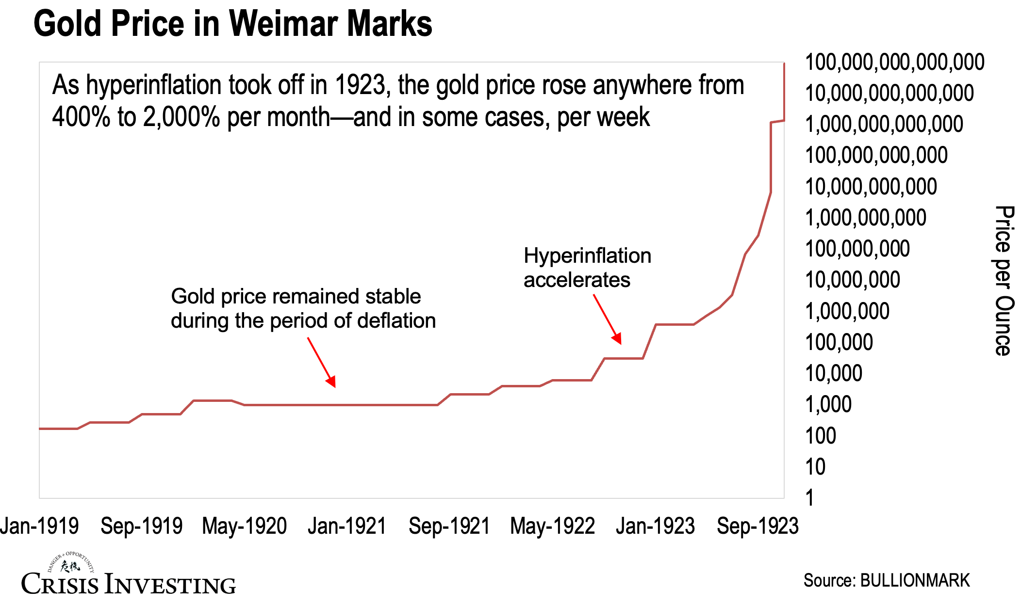 That’s why I wanted to share this chart today. It’s a sobering reminder of what happens when a currency completely collapses. Take a look at what happened to the price of gold—in German marks—during the infamous Weimar hyperinflation.