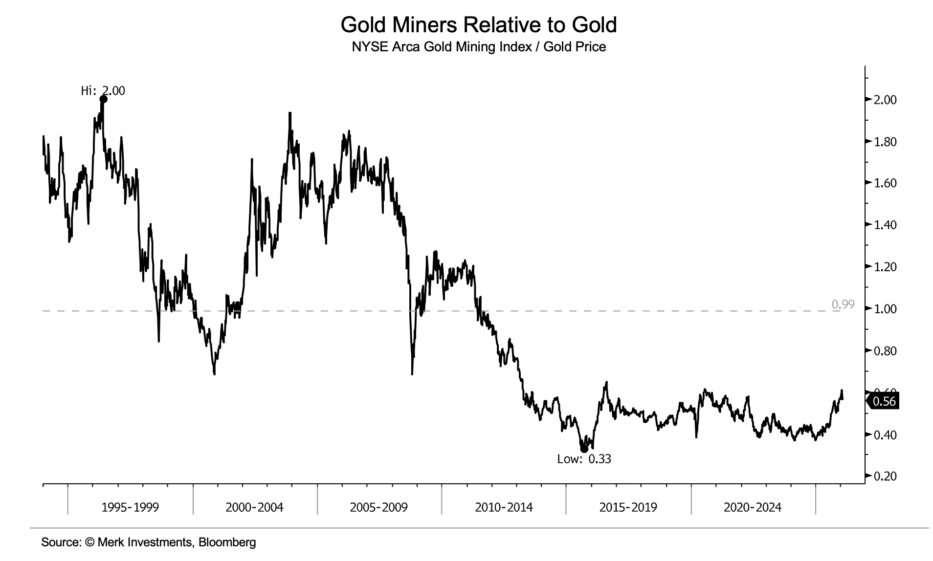Over the past 30+ years, the ratio of gold mining stocks to gold has swung from a high of 2.00 in the mid-1990s to a low of 0.33 in 2015.