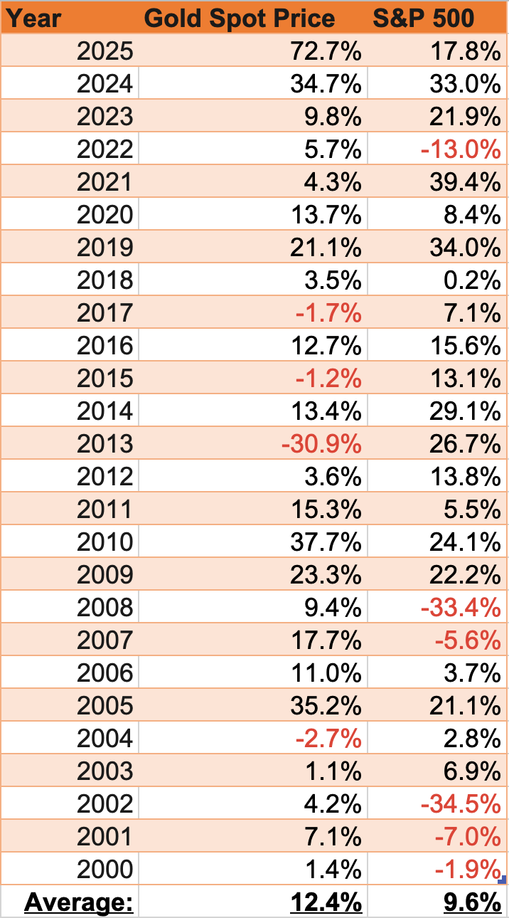 Yesterday, I wrote to you about how gold demolished stocks this year—finishing 2025 up 73% compared to just 18% for the S&P 500. A few readers wrote in pushing back with a familiar objection: sure, gold crushed it in 2025, but only because of the chaos—Trump’s tariffs, geopolitical turmoil, and general boat-rocking. In normal times, stocks are still the better bet.