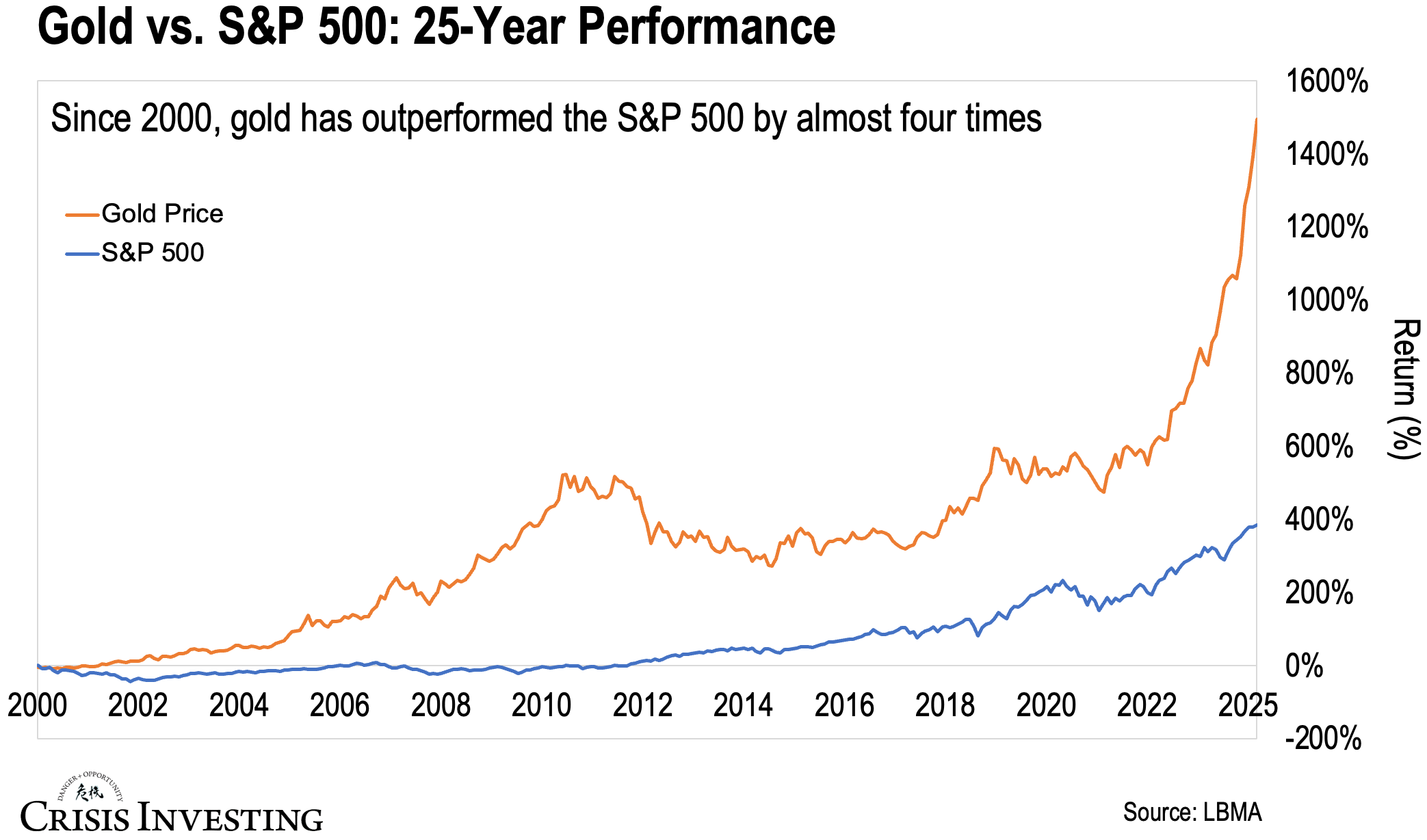 Put in dollar terms: if you’d invested $5,000 in gold back in 2000, you’d have around $79,700 today. That same $5,000 in the S&P 500? About $24,200.