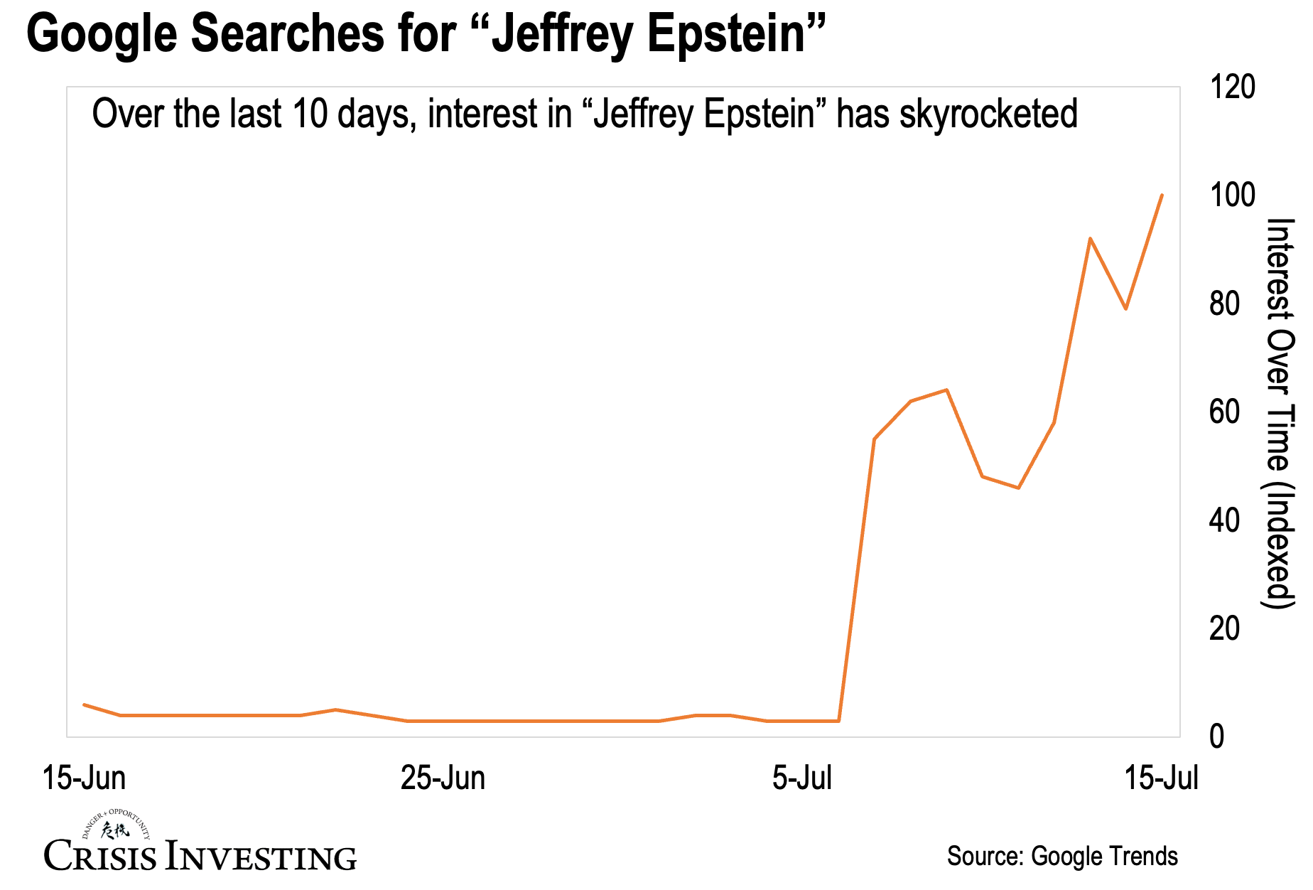 In fact, searches for “Jeffrey Epstein” are up a staggering 3,200% from just ten days ago. And from the looks of it, we’re nowhere near the peak.
