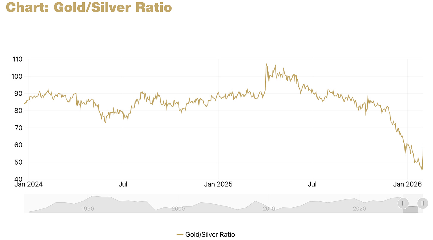 For context, when we first started recommending silver positions last year, the GSR was well above 80—sometimes over 90. Silver looked historically cheap relative to gold. Today, at a GSR of 60, one could make the case that’s no longer true.