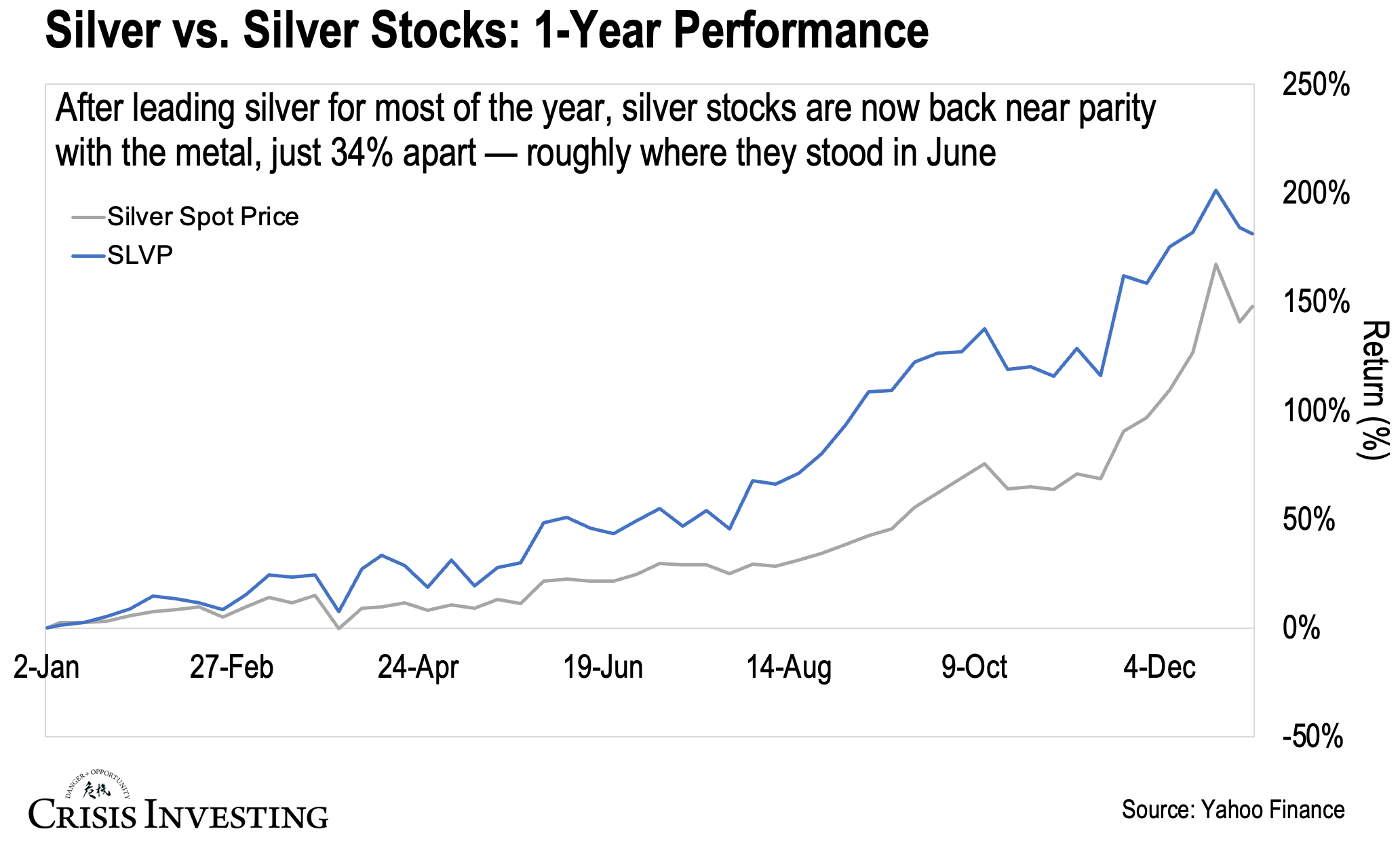 After leading silver for most of the year, silver stocks are now back near parity with the metal. Silver gained 147% over the past year to today, while silver stocks returned 181%—just 34% apart. As you can see in the graph above, that’s down from a much wider gap that peaked in October.