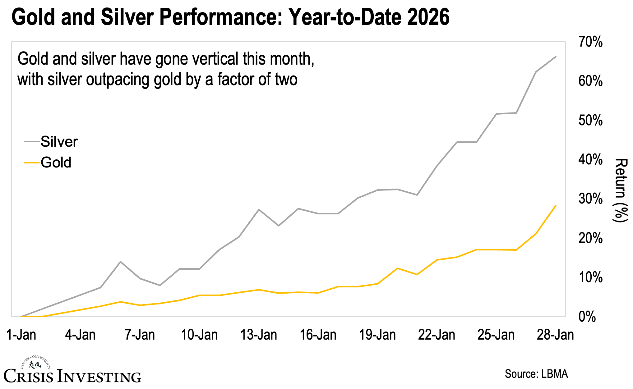 But what’s even more remarkable is the price action we’ve seen just this month. Since January 1st, gold has surged from around $4,330 to over $5,500—a nearly 30% gain in less than 30 days. Silver’s move has been even more dramatic, climbing from around $71 to $118—a 66% jump in the same period.