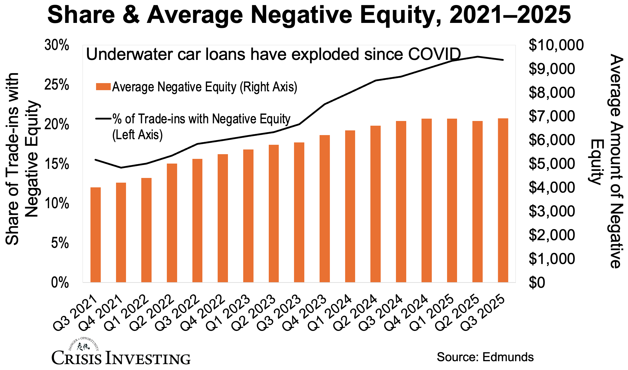Now those inflated prices are coming back to earth, but the loan balances aren’t. When car values depreciate faster than loan balances decline, you get trapped. You can’t sell without taking a loss, and you can’t refinance into better terms.