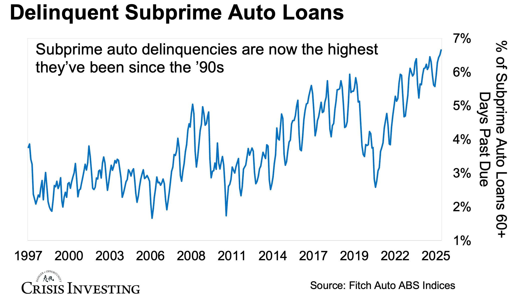Subprime borrowers are getting crushed, with 6.65% of loans at least 60 days delinquent as of October 2025. That’s the highest level in over 30 years—worse than anything we saw during the Great Financial Crisis.