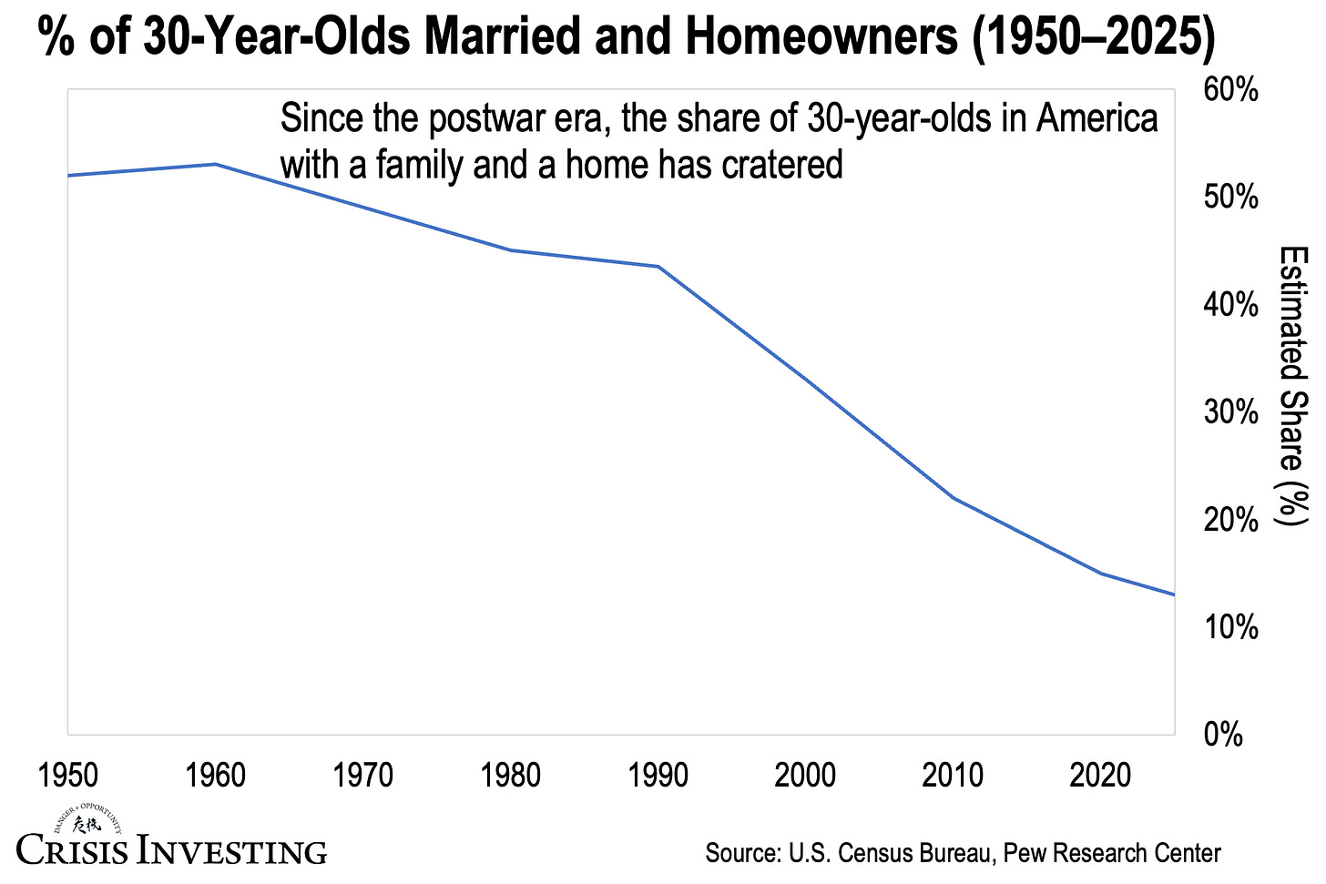You can see it in stark terms in this week’s chart below. Since the postwar era, the share of 30-year-olds in America with both a family and a home has plummeted—from about 52% in 1950 to just 13% in 2025. That’s a staggering 75% decline over 75 years.