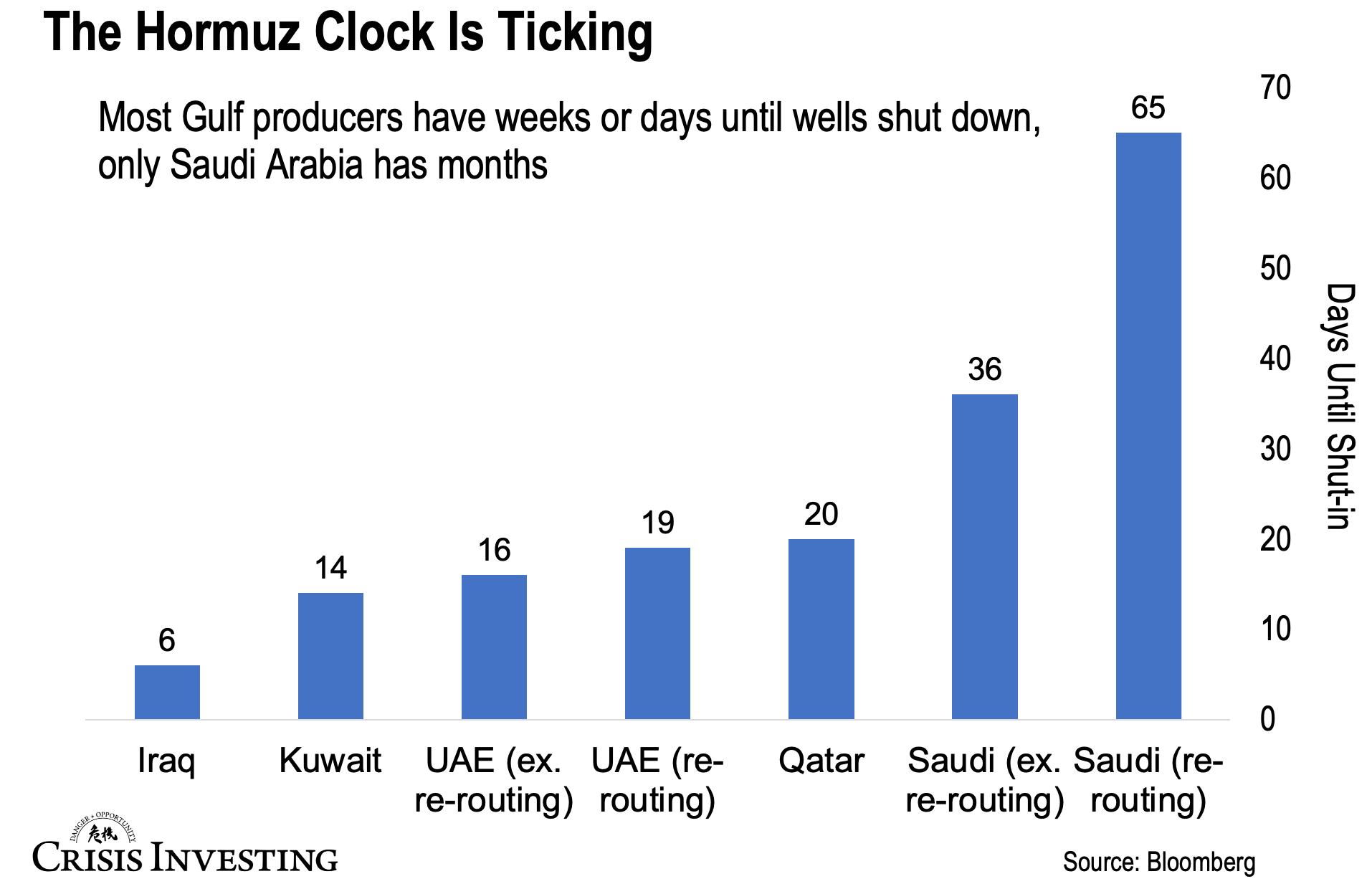 Note: The chart shows two scenarios for Saudi Arabia and UAE. “Excluding re-routing” assumes they rely only on Hormuz; “re-routing” shows the extended timeline when using their alternative pipelines—Saudi Arabia’s East-West Pipeline (5M bpd nominal capacity, up to 7M bpd max) and UAE’s Habshan-Fujairah pipeline (1.5M bpd)—which bypass Hormuz through Red Sea ports. However, these pipelines cannot replace full Hormuz export volumes.