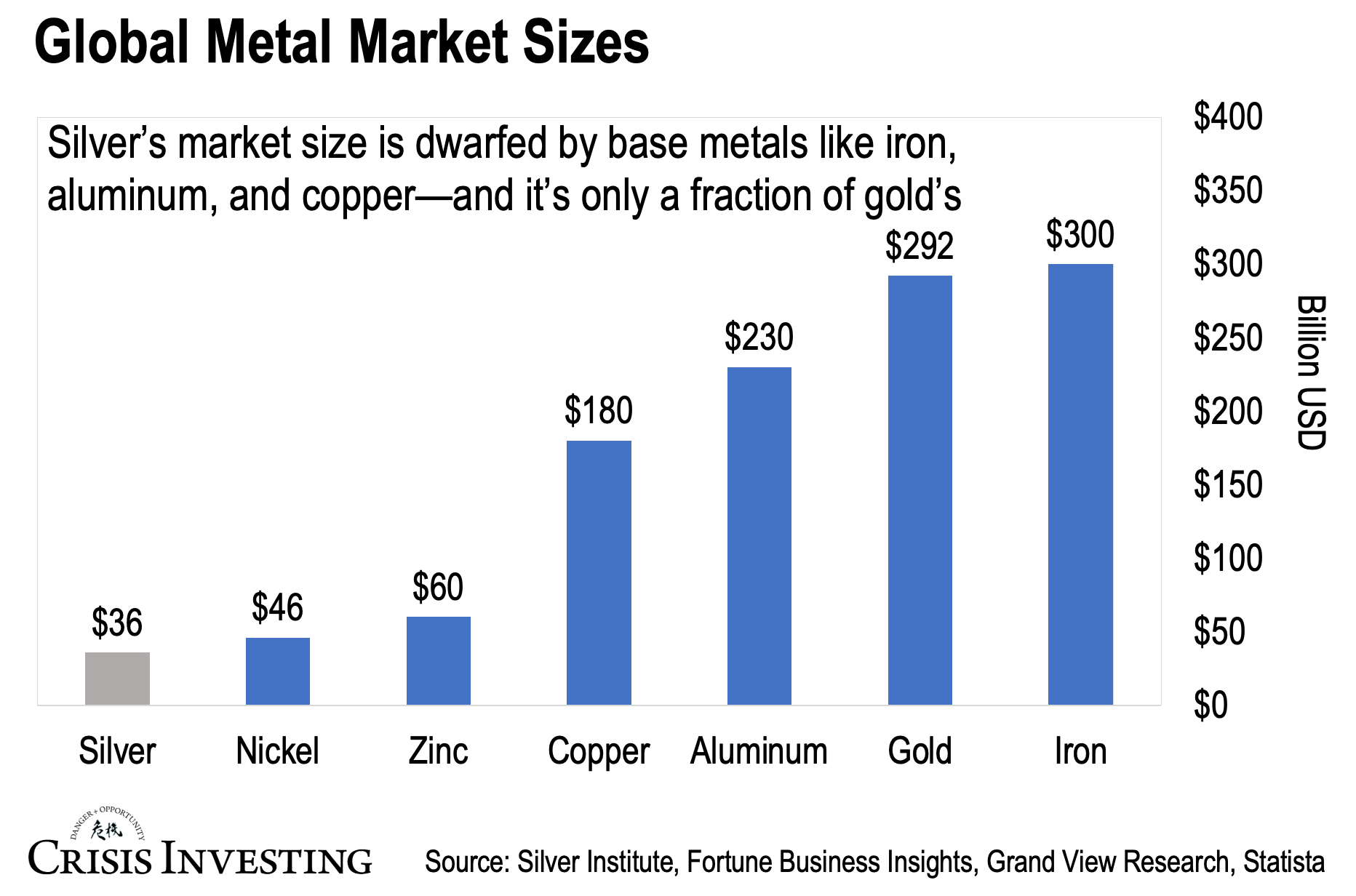 As you can see, the silver market is only about one-eighth the size of the global gold market. It's actually smaller than even the zinc and nickel markets—industrial metals most people don't think about at all.
