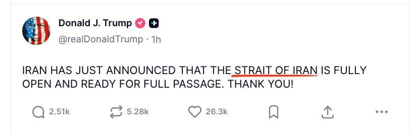 He got the name wrong. It’s the Strait of Hormuz, not the “Strait of Iran.” But that’s the least of the problems here.