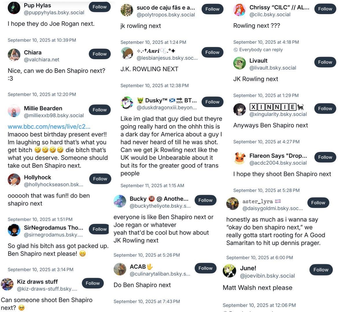 What did happen was an avalanche of mockery. Left-wing users flooded TikTok with clips of people laughing, dancing, and celebrating Charlie Kirk’s death. On X, 10-second soundbites of his debates were posted with captions like “good riddance” or “one down.” Others went further, openly speculating about who “should be next” — with conservative, pro-Israel commentator Ben Shapiro seemingly being everyone’s favorite target. Here’s a quick compilation I came across. Click to zoom in if you want a closer look.
