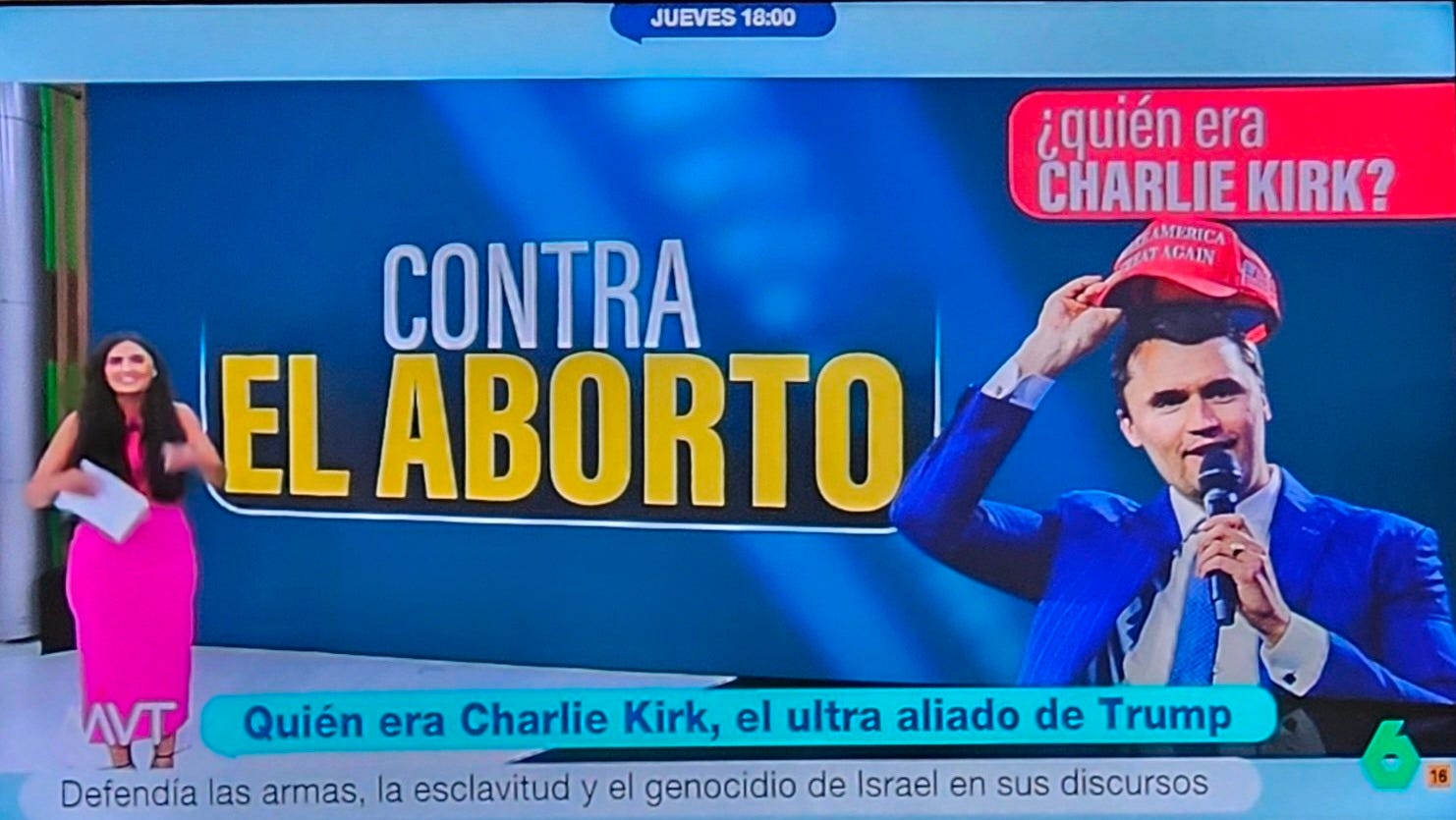 Or here’s a screenshot from the Spanish show Más Vale Tarde (MVT) on La Sexta, where they gleefully rattled off Charlie Kirk’s supposed positions — some real, others fabricated — on abortion, slavery, Israel, and race, painting him as a monster whose assassination was no tragedy at all.