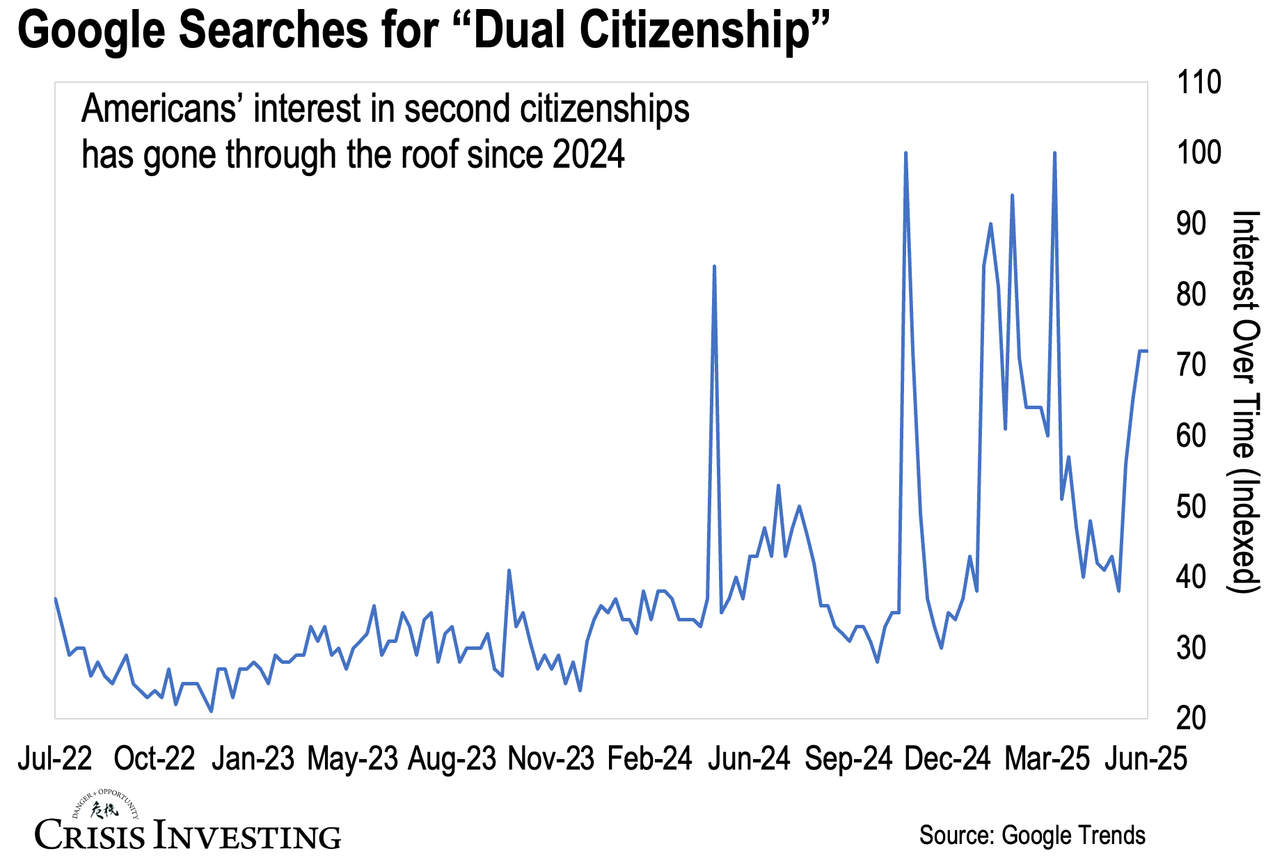 And while Tucker’s telling regular Americans to stay “lashed to the mast,” an increasing number of Americans are quietly doing the opposite. Just look at the chart below—Google searches for “dual citizenship” have been spiking again and again over the past 18 months.