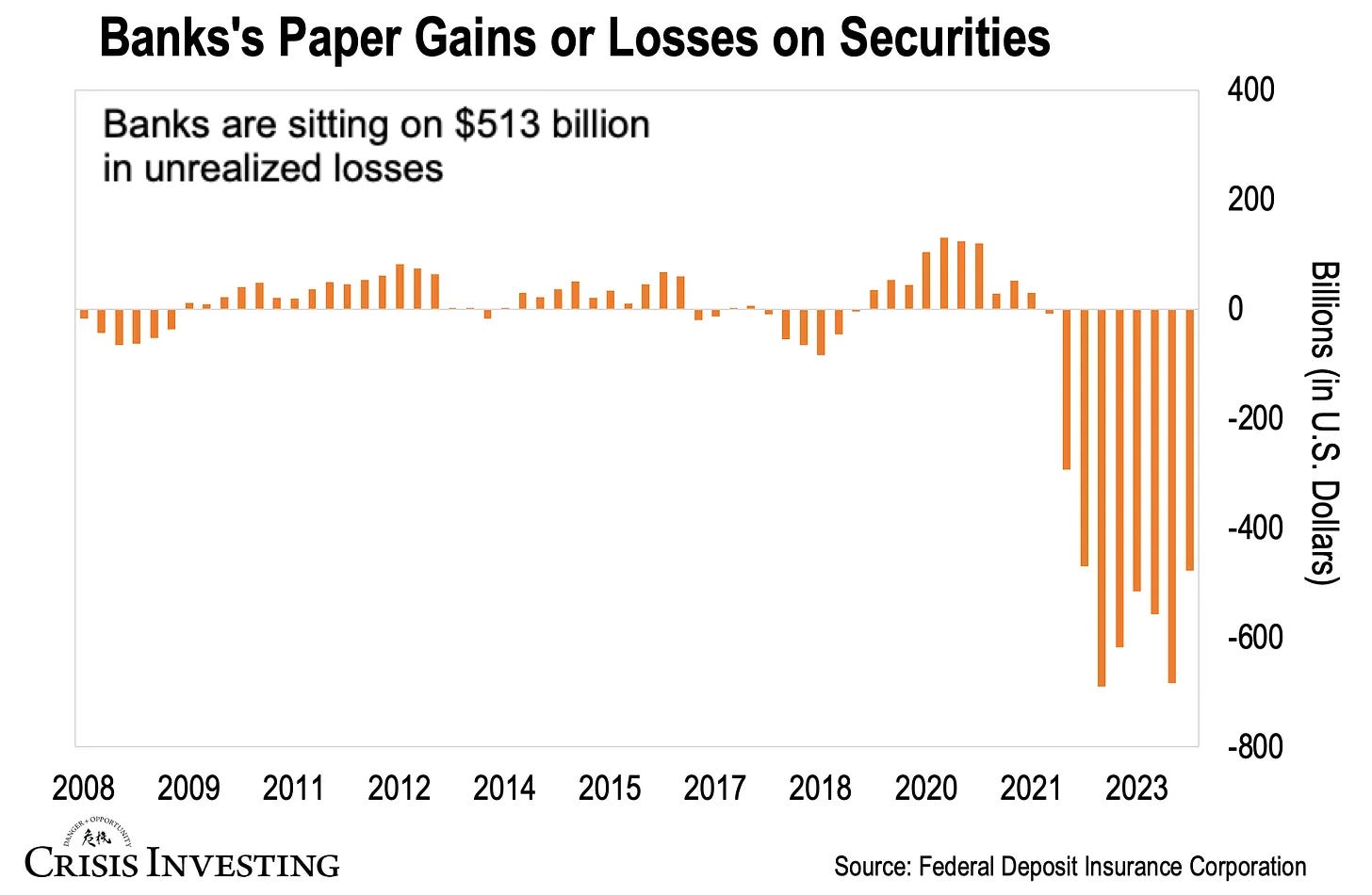 Speculation aside, here’s what we do know for a fact: U.S. banks as a group are currently sitting on $513 billion in unrealized paper losses on securities.