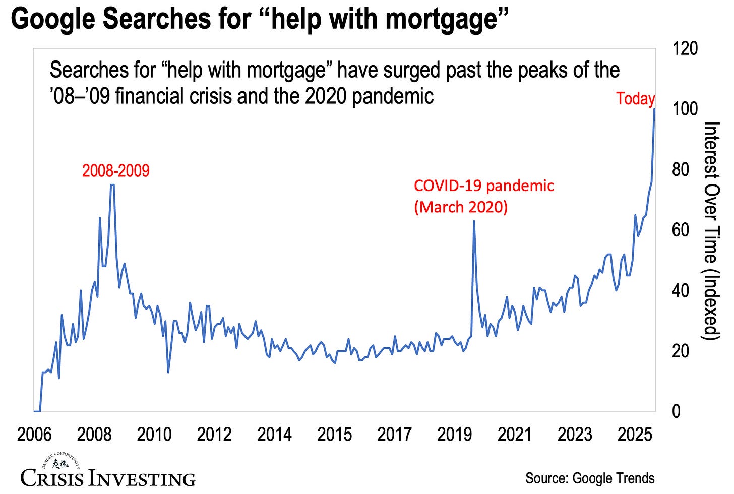 As you can see, Google search trends for “help with mortgage” just hit their highest level in 16 years—higher than the COVID spike and higher than the 2008-09 peak. Now, you may remember what happened back then: millions of families losing their homes, unemployment soaring, and a full-blown financial meltdown—the Great Financial Crisis.