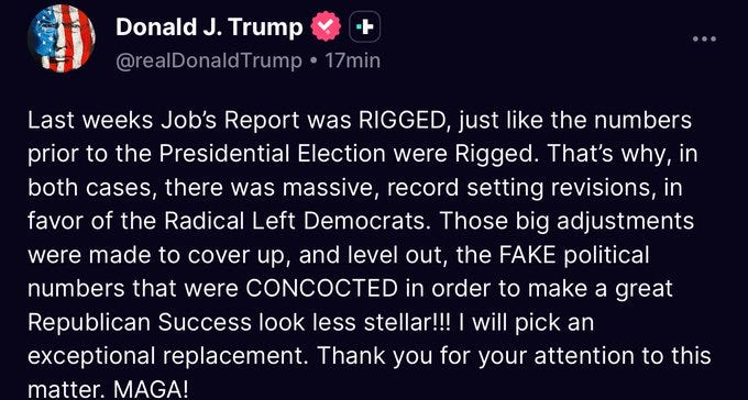 Now that the job revisions show the labor market is far weaker than anyone thought—remember, we’re talking about 258,000 phantom jobs—Trump may finally have what he needs to justify the monetary policy he's always wanted.